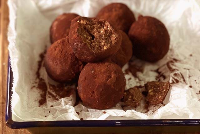 | 材料をフードプロセッサーにかけて、一口サイズに丸め、ココアをまぶし冷蔵庫で冷やして完成。 メープルシロップをデーツシロップやハチミツに変えてもOK。 お好みでドライフルーツやナッツをいれてお召し上がりください。 |